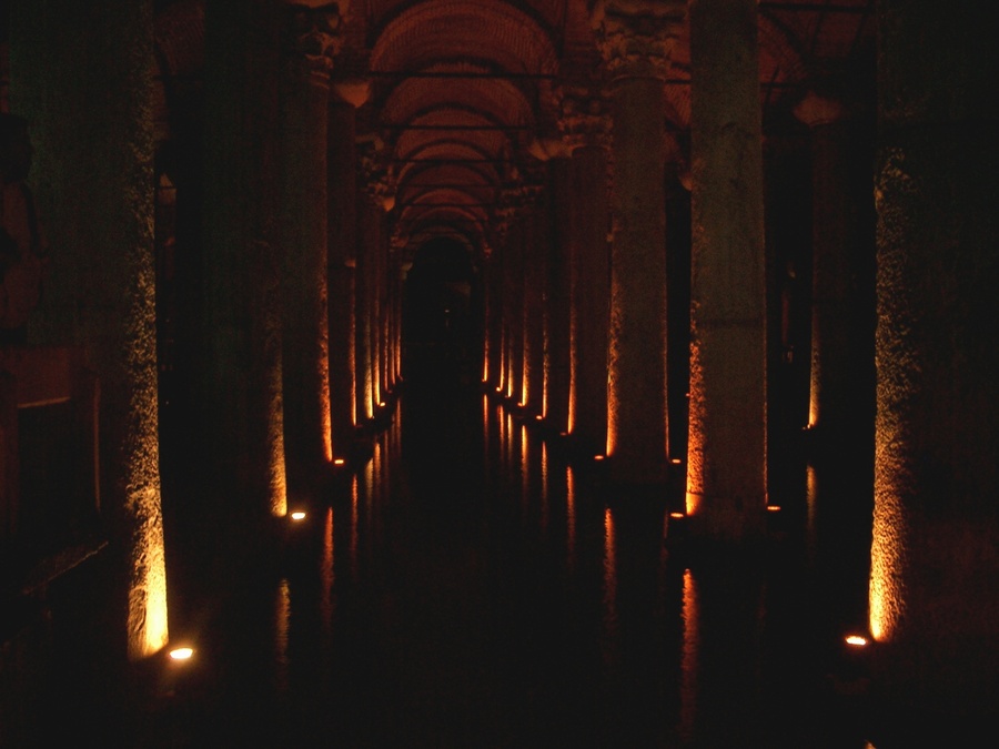 ローマ帝国時代に築造された、地下の大貯水池。水道橋から引いた水はこの貯水池に蓄えられ、トプカプ宮殿などに供給された。ライトアップされた内部は、とても神秘的。